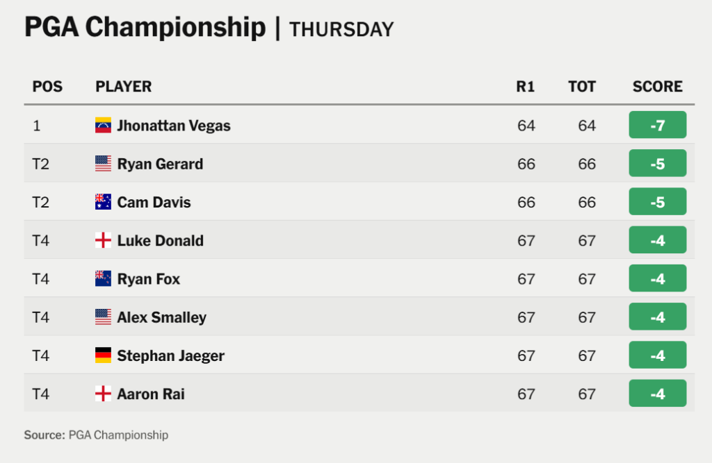 Jhonattan Vegas membuat gebrakan di hari pertama PGA Championship yang berlangsung di Quail Hollow Club, Kamis (15/5) waktu setempat. Pegolf asal Venezuela itu tampil luar biasa dengan skor 7-under-par 64 untuk memuncaki leaderboard.