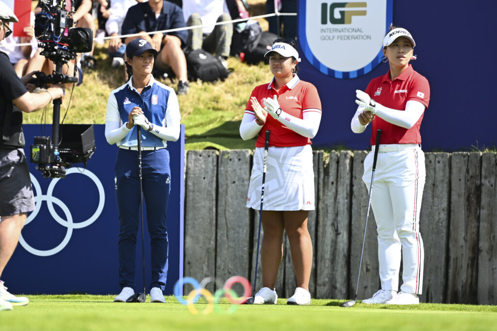 Dari kiri ke kanan: Celine Boutier (FRA), Lilia Vu (USA), dan Amy Yang (Korea) pada Olimpiade Paris 2024 di Le Golf National, credit: Tracy Wilcox/PGA TOUR.